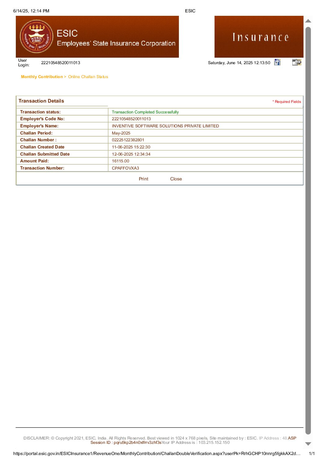 ESIC Challan BRPL May-25